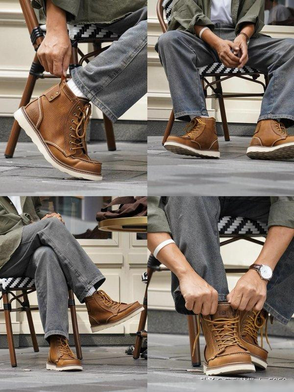 40+买鞋,早过了“为潮买单”的年纪,最在意“舒服、耐穿、能搭80%的衣服”。棕色工装靴为什么是首选?比黑色软和,比白色耐脏,自带复古感,配卡其裤是“工地风”?不,配卡其裤是“复古工程师”,配灰蓝牛仔是“文艺老男孩”,配黑色西裤甚至能穿出雅痞感——你衣柜里的裤子,它基本都能hold住。材质要选头层牛皮,越穿越有光泽,不像合成革穿几次就爆皮;鞋底选橡胶软底,有弹性但有支撑,早上送孩子上学走2公里,下午去超市买东西,脚都不酸——这才是40+要的“实用主义”。
